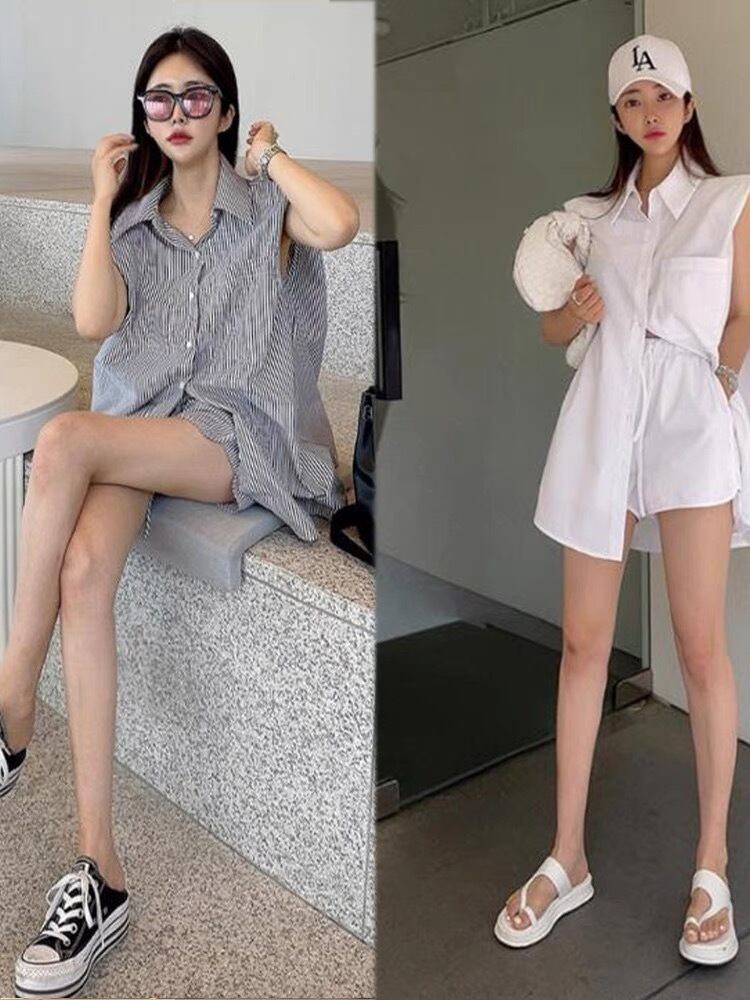 このセットアップは、シンプルながらも上品なシャツデザインとノースリーブのシルエットが特徴で、カジュアルからビジネスシーンまで幅広く活躍します。友人とのランチや仕事の会議、さらには休日のお出かけにもぴったりです。
